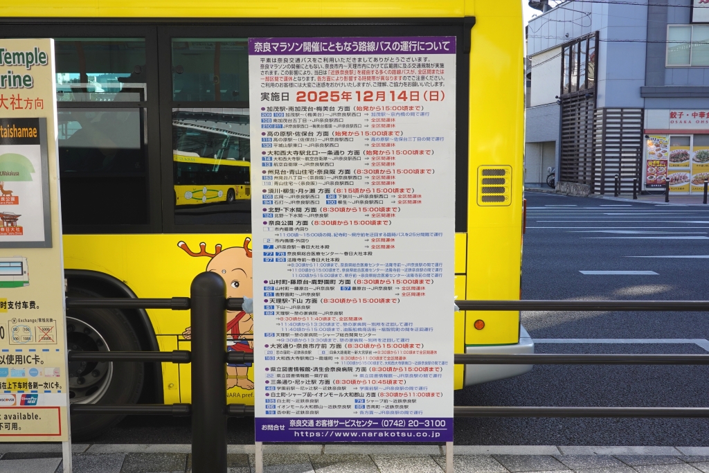 奈良公園付近はマラソンの往路と復路にあたるため、市内循環線、山村線、青山住宅線などの下記の系統は8:30頃から15:00頃まで運休する。